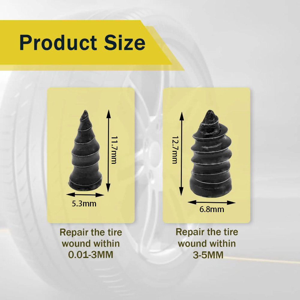 • We Provide 2 Sizes: This small tire repair screw is for repairing a 1mm to 3mm hole and the larger size screw is for repairing 3mm to 5mm holes. Use the small one if your car or motorcycle tire is punctured with a small & thin nail. If the nail is larger, then use the bigger size.